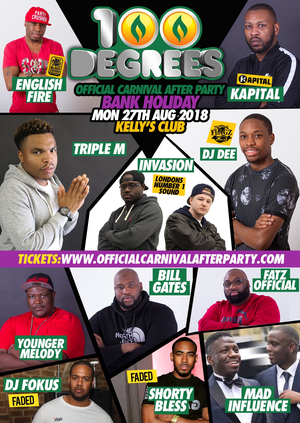 100 DEGREES - OFFICIAL NOTTING HILL CARNIVAL AFTER PARTY > Bank Holiday Monday 27th August 2018 > @ Kelly’s Club, NW4 3LH > 10PM - 4AM / Last Entry 1.30AM Music Policy Dancehall / Soc...